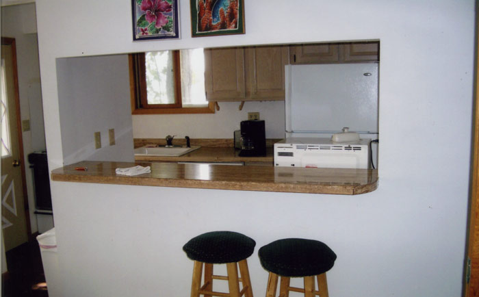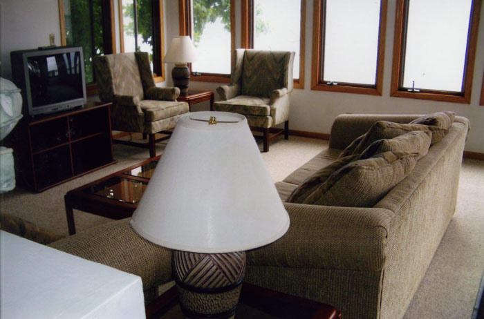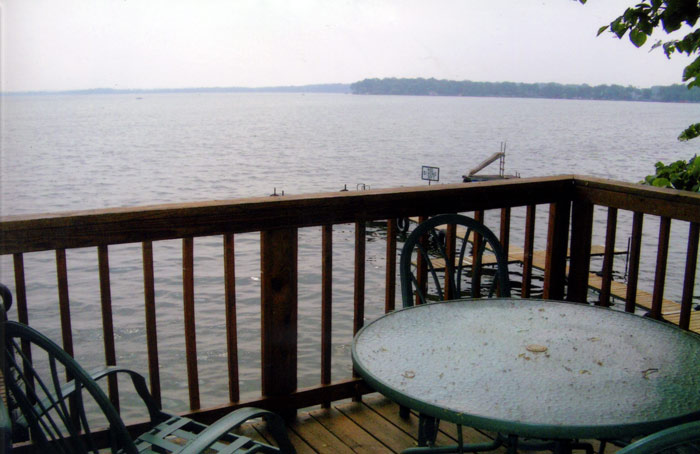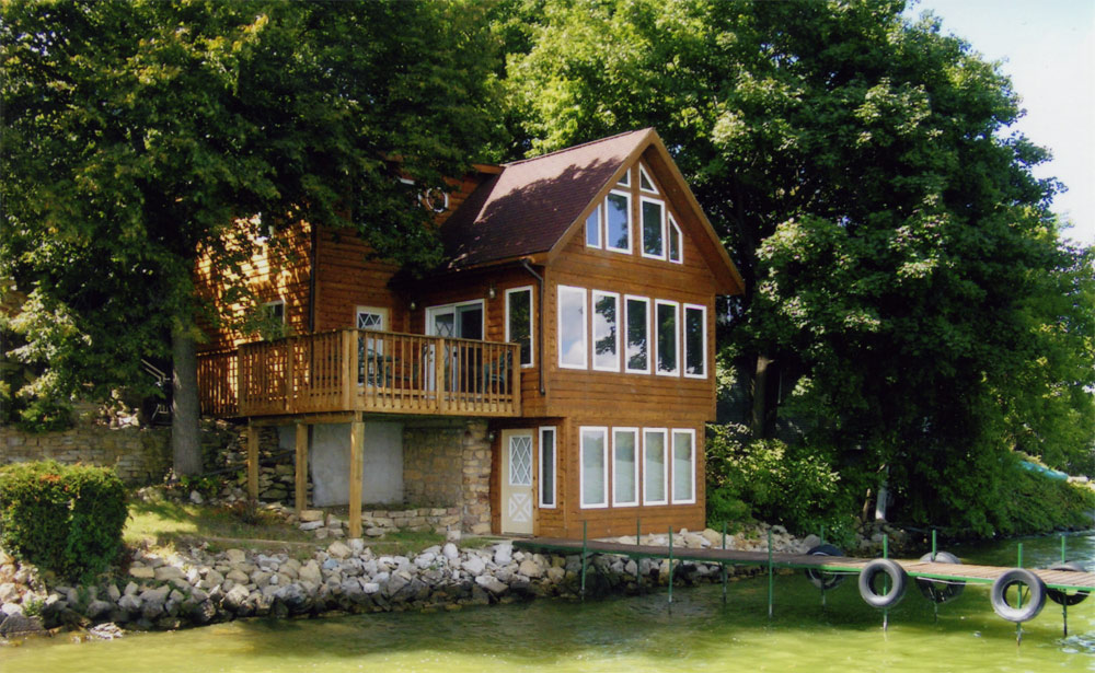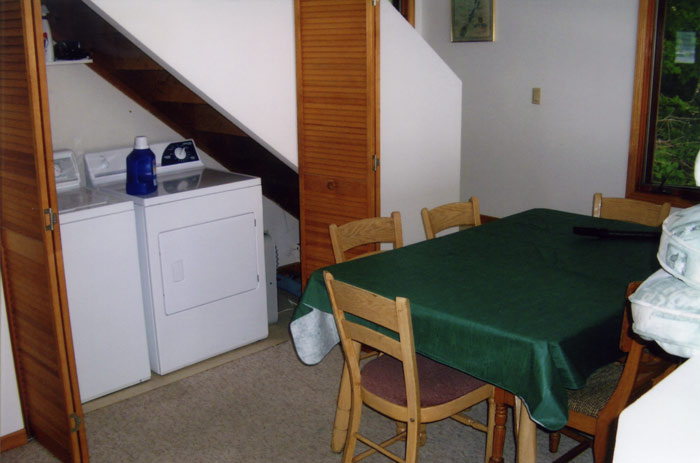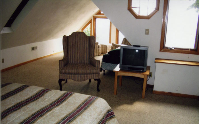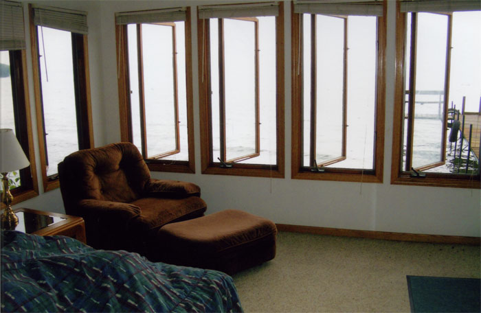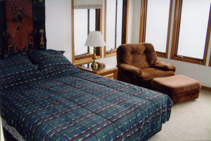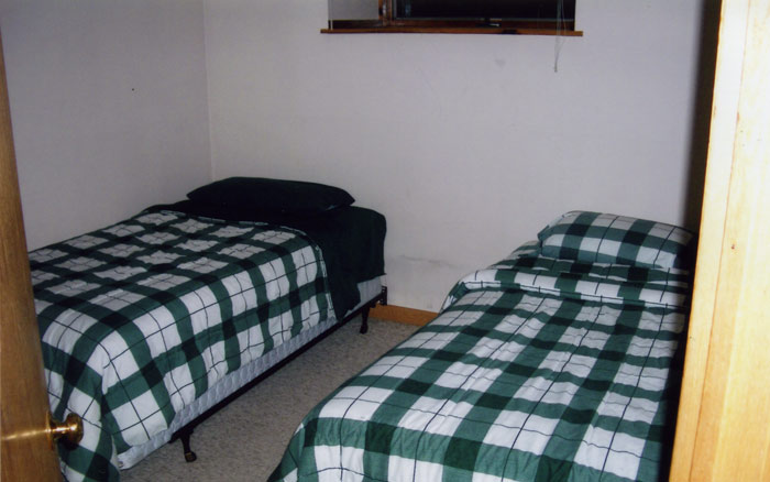 On the bottom (lake) level, there is a bathroom and two bedrooms. One has a queen bed, the other has two twin beds.